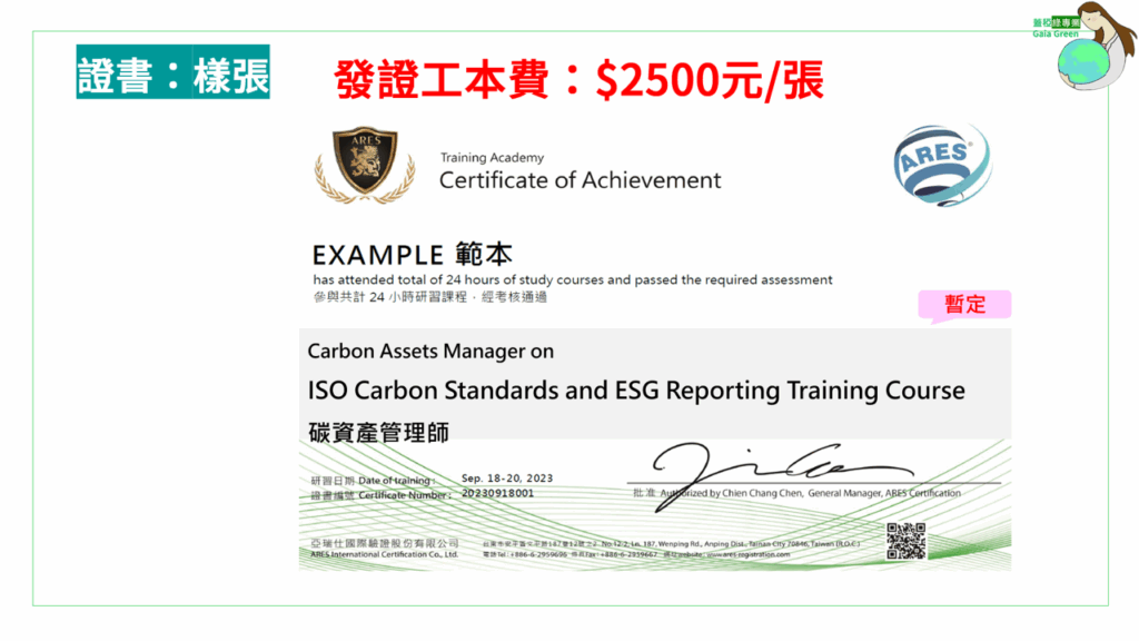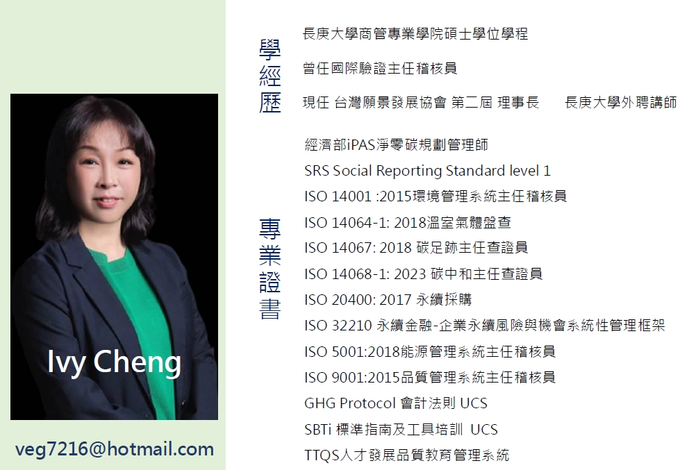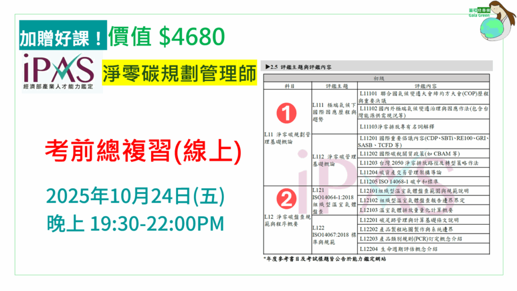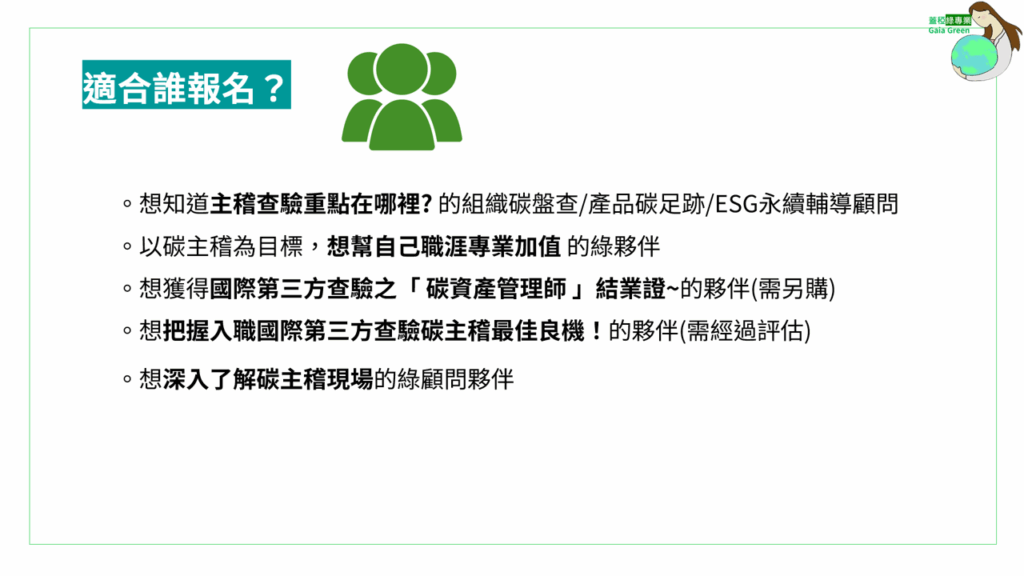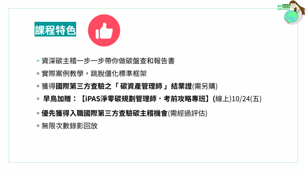 課程資訊 ● 授課方式:線上班 ● 上課日期: 2025年11月5日(三)~13日(四)期間的四天晚上時段 +加Q&A場– 2025年11月14日(五) 共五堂課 +加贈好課:2025年10月24(五) 【iPAS淨零碳規劃管理師.考前總複習】● 上課時間: 19:30-22:00 PM (課程共>12小時) ● 上課地點:線上google meet 簡介 碳主稽身為碳盤查報告書的主考管,輕鬆制霸碳管理生物鏈頂點。90%的綠夥伴都嚮往可以成為碳主稽,但真正知道變成碳主稽的人不到10%。想成為那10%可以成為碳主稽的實力派嗎?那是時候告別瑣碎的碳盤查思維,讓資深主稽安姵帶著你,實際打造屬於你的主稽之路、盡情向上攀升吧! 我們都知道,碳盤查的職涯頂點就是主任查驗員=Lead Auditor(LA)=主稽,對吧? ^_^?因為,碳盤查的生態系中,要完成ISO的那本報告書(考試),中間有考生=企業、家教=輔導顧問、主考官=主稽。主稽身為主考官,是負責改考卷,幫企業打分數,決定企業寫的這張考卷(報告書)有沒有合格的、可不可以發合格證的,考生(企業)和家教(輔導顧問)所有的努力,都是要給主考官(主稽)看的,你說是不是頂點來著?家教(輔導顧問)需要幫企業到工廠現場,陪著第一線同仁,上刀山下油鍋、大汗淋漓的去把數據生出來;但考官(主稽)則是接受高階主管,微笑哈腰請到會議室,冷氣、飲料、便當傳好好,多怕服務不周到、影響主稽改考卷心情怎麼辦?為何會有這樣截然不同的待遇?因為家教(輔導顧問)不需要任何的資格,但要想要成為主稽、享受頂點的待遇,可是需要非常嚴格的訓練和資格的。另外一個好處就是:主稽的專業精實,薪水也很扎實。資深的獨立查驗員的話,是依案計價,也可以斜槓各種輔導顧問,也很有機會可以做到「上不封頂」。但就因為主稽的訓練和要求如此嚴格,所以現在市場上,非常缺主稽!市場上大缺,那就是我們綠夥伴的大好機會啦!! ^)^安姵2021年前也是小白,她從0開始點點累積、步步進階成為查驗員、再關關難過關關過的成為大主稽。她本來擔任國際查驗公司的專任主稽,但因為三年60場查驗+40場授課輔導的業務量太累人,(對!就是這麼缺人!)她想要更多的時間自由,所以退下來,改當外聘的「獨立查驗員」,也多了更多的時間可以「作育英才」和其他發揮。另外,在探查驗的現場,常常會碰到這樣的情況:「顧問在輔導企業做碳盤查時,可能是因為他們不知道查驗重點在哪裡吧?常常他們自顧自的、千辛萬苦幫企業完成的報告書。從我們主稽眼裡看來,通通不合格!」想起之前我們夥伴BSI的ISO一姐也說過:「每次看到顧問公司自我感覺良好做出的報告書,都覺得很可惜;但做成這樣就是不符規定,我實在不能給過,不忍心也只好開缺失,請他們重做。」Orz<-身為顧問公司,要是被這樣要求,又該情何以堪啊? @_@碳盤查不是會算就好,還需要知道主稽查驗的重點在哪裡?這才是真正的本事。因此,讓主稽安姵用她的「主稽視角」,來教我們怎麼樣做好「符合主稽查驗標準」的ISO和ESG報告書吧!課程:蓋稏綠.碳管理師進階實務班【資深碳主稽視角教你做】ISO14064-1、ISO14067、 ISO50001、ESG報告書四堂課針對3個常見ISO主題+ESG報告書,外加一堂QA專堂,共12+個小時的實例解說,我們資深主稽安姵,濃縮她三年上百場的專業累積,教你做出一次就合格的精準ISO和ESG報告書。 本課程適合誰參加? 本課程能力定位在哪裡? 你不能永遠都當小白!既然走上了這條綠領路,當然是要讓自己精益求精、步步高昇啊!^O^ 課程特色 全局思維、系統思考,你要會的不只是碳盤查,更要用更高維的角度,來解析碳管理的碳奧秘。並搶先獲得入職國際第三方查驗機構主稽的機會(需評估)。 課程講師 💰 課程費用:NT$ 28,800 優惠特價:NT$14,800 加值好課 萬丈高樓平地起,不管你現在的程度在哪裡,都一定要有著堅實的基礎。加值好課用堅實的iPAS淨零碳規劃管理師總複習,讓你複習所學+展望未來。 幫履歷表加值! 用國際第三方查驗機構所頒發的結業證書,幫自己的履歷表聰明加值吧! 馬上捉住機會(不含證書)$14,800 馬上捉住機會(含證書)$17,300